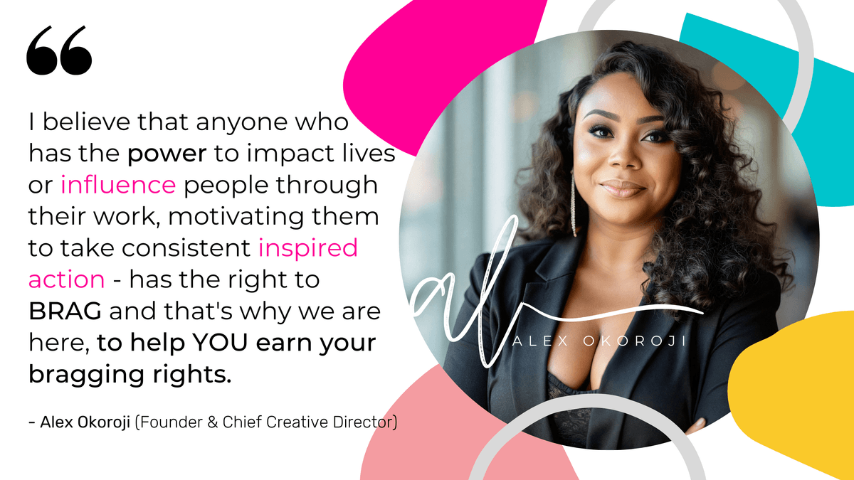 Hi, I'm Alex Okoroji, the Founder & Chief Creative Director at The BRAG Media Company. In today's crowded and extremely noisy world, it has become more challenging for creative individuals, industry experts, and business owners to stand out, be seen, and be heard. That's why I created this agency to support creators, experts, and business owners like YOU who want to (B)oldly (R)adically (A)chieve (G)oals, and, develop high-impact branding, products, content, platforms and services that are the highest expression of your brilliance and differentiate you from the rest of the crowd.